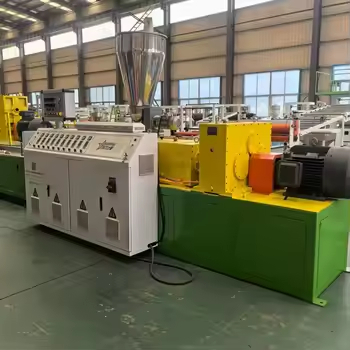 Ito ang pangunahing yugto ng buong proseso ng paggawa. Ang pinaghalong pulbos ay sinipsip sa hopper ng isang conical twin-screw extruder sa pamamagitan ng isang vacuum loader.