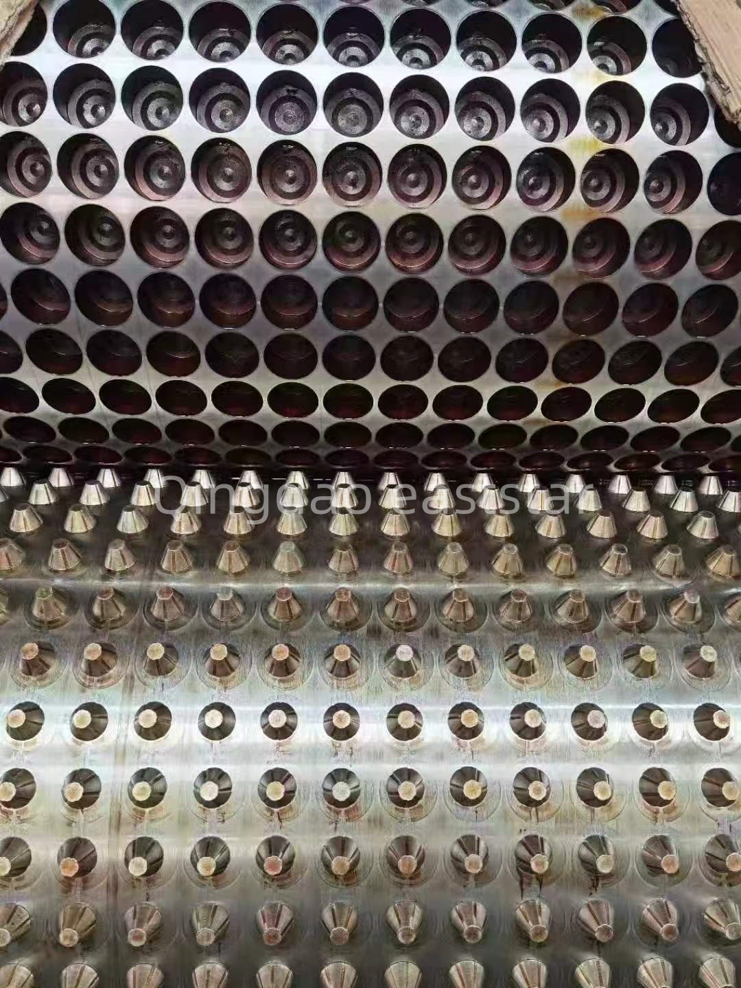 Ang die system ngPE Drainage Board Production LineNag-ampon ng isang disenyo ng runner ng coat hanger, na may isang lapad ng mamatay na 1650mm, na may kakayahang gumawa ng mga single-layer na mga board ng kanal na may kapal na 0.8-1.2mm. Ang die runner surface ay chrome-plated at pinakintab sa isang salamin na tapusin, na may isang lukab ng lukab ng RA0.1um at isang die lip gilis ng RA0.05um. Ang aparato na bumubuo ng two-roll ay nilagyan ng φ450 × 1700mm rollers, na may isang roller na tigas na hrc58-62 at isang kapal ng plating ng chrome na 0.08mm. Ang isang espesyal na disenyo ng multi-runner ay nagsisiguro ng pantay na temperatura. Ang mga propesyonal na pagsasaayos ay ginagarantiyahan na ang mga produktong board ng kanal na ginawa ngLinya ng ProduksyonMagkaroon ng isang pantay na tuldok na istraktura at matatag na pagganap ng kanal.