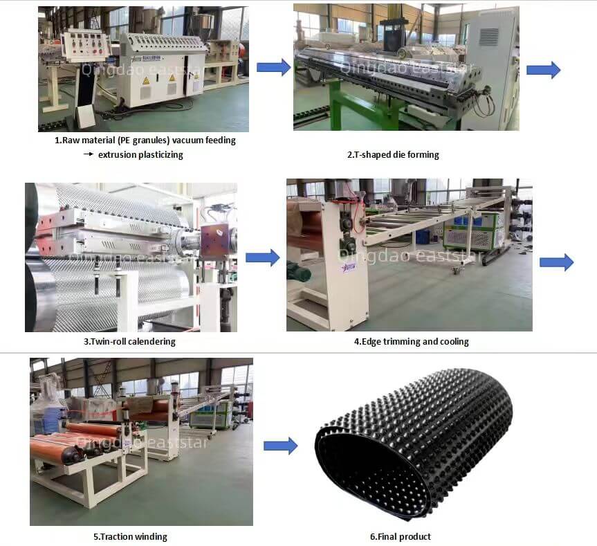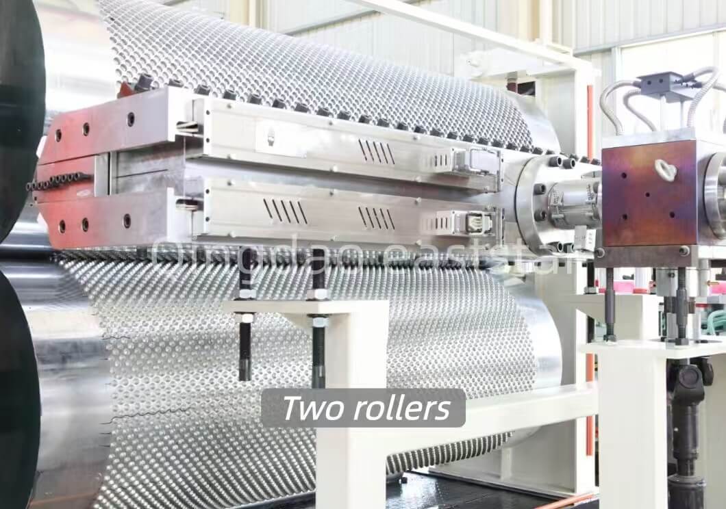 Ang linya ng produksiyon ng Eaststar's Drainage Board ay isang kumpleto at mahusay na solusyon na idinisenyo para sa malakihang paggawa ng mataas na kalidad, high-density polyethylene (PE) na mga kanal na kanal. Ang pinagsamang linya ng produksiyon ay awtomatiko ang buong proseso mula sa pagpapakain at extrusion hanggang sa paghubog at paikot -ikot. Sa gitna ng linya ng produksiyon na ito ay isang matatag na 105/33 single-screw extruder na ipinares sa isang katumpakan na coat na hanger-style T-Die, tinitiyak ang matatag at pare-pareho na matunaw na daloy para sa pantay na output. Bukod dito, ang linya ay nilagyan ng isang advanced na twin-roll na bumubuo ng yunit at isang sistema ng vacuum, na nagpapagana ng tumpak na paggawa ng mga board ng kanal na may karaniwang lapad na 1500mm at isang adjustable na kapal mula sa 0.8mm hanggang 1.2mm. Kilala sa pagiging maaasahan, katumpakan, at mataas na antas ng automation, ang linya ng produksiyon na ito ay ang piniling pagpipilian para sa mga aplikasyon sa konstruksyon, engineering civil, at landscaping.