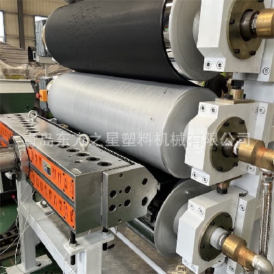 Tinitiyak ng 1150mm coat hanger-style gradient flow channel mold ang pare-parehong pamamahagi ng pagkatunaw sa buong lapad. Ang ∮400mm large-diameter three-roll calender, sa pamamagitan ng tumpak na temperatura at pressure control na may mirror-finish rollers, ay gumagawa ng mga de-kalidad na substrate na may maliit na kapal, mababang panloob na stress, at makinis na ibabaw—isang mahalagang kinakailangan para sa kasunod na pag-emboss ng malinaw at matibay na "tortoise-shell" na mga texture.